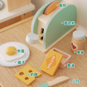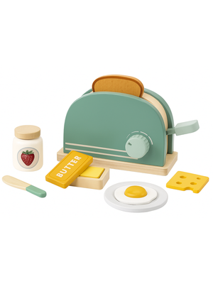 - Includes toaster, 2 bread slices, egg, cheese, butter, jam jar, and wooden knife