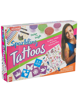 Create dazzling, glittery body art with this all-in-one tattoo kit! The Glimmer & Glow Tattoo Studio is a complete DIY kit packed with over 50 pre-made tattoos, stencils, glitter, and tools for endless creative fun. Safe, sparkly, and easy to use—this set brings the tattoo salon experience right into your home!
